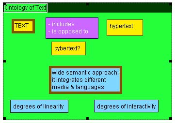 The "text" still seems to be a rather elusive object, whose often unstable status is further undermined by the necessity to include hypertext in its definition. As a general cathegory, "text" is very useful, and both sessions took a pragmatic approach understanding text in the broad semiotic sense, so that it's an encompassing cathegory that can integrate different media and languages.