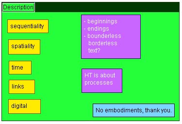 People were more interested in discussing characteristics than absolute terms. For example, the category "cybertext" (Aarseth) came up as a way of questioning assumptions when trying to define textuality.