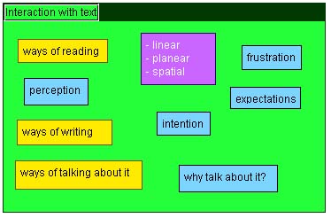 There isn't still a fixed terminology to talk about hypertext (this was suggested by some participants to be positive). Our vocabulary is "fuzzy". However, it's clear that there are different possibilities of interaction with the (hyper)text. The attendees made an effort at proposing categories to characterize perception and reading. Perception could be either linear, planear or spatial, depending on our level of engagement with the text. Here we talked a lot about Jane Douglas's paper on "Engagement, Immersion and Flow", and also about Bolter's ideas of "looking at" and "looking through" the text. Not to forget when talking about hypertext's reading processes is the dreaded phrase that kept on coming up: frustration of expectations.